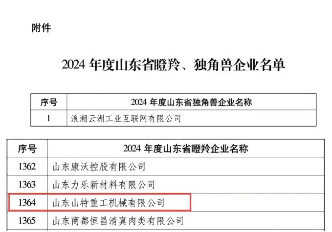 近日,山東省工業(yè)和信息化廳發(fā)布《關于公布2024年度山東省瞪羚、獨角獸企業(yè)的通知》,山特重工憑借著卓越的創(chuàng)新能力、高速的成長態(tài)勢,成功獲評2024年度“山東省瞪羚企業(yè)”。